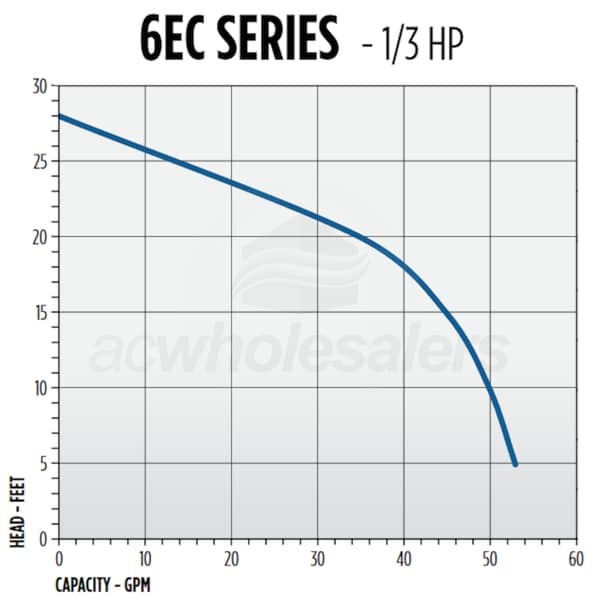 Little Giant 6EC Series pumps feature 1 / 3 HP Permanent Split Capacitor ( PSC ) motors providing lower current draw, energy efficiency, improved performance and cooler-running for durability. Built on the industry's best 6E platform, the 1 / 3 hp 6EC series consumes only 6.0 amps while producing 50 gpm @ 5 ft. of head and reaching a maximum shut off of 22 ft. The new unit also includes a stainless steel plate on the volute as a debris filter, creating lower intake velocities and pump stability.