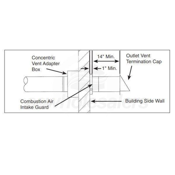 This is a horizontal concentric venting kit designed for use with Modine gas fired condensing unit heaters. The kit includes a concentric vent kit adapter box for arranging the tubing properly, as well as both vent and combustion air pipe terminals an termination guards.