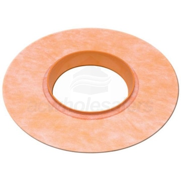 Schluter-KERDI-SEAL-MV is a mixing valve sealing sheet made out of the Schluter-KERDI waterproofing membrane. The circular sheet has an opening in the middle for a mixing valve to pass pipe through, sealable by Schluter-KERDI-FIX sealing compound, and also includes an overmolded rubber gasket.
