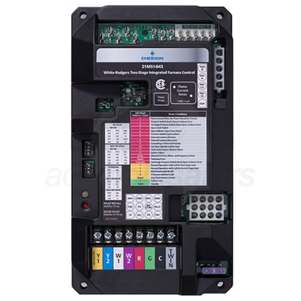 The 50M51-843 is a universal replacement control for two-stage automatic gas ignition controls employing a microprocessor to continually monitor, analyze, and control the proper operation of the gas burner and inducer. The 50M51-843 controls a multiple tapped induction circulation blower. Signals interpreted during continual surveillance of the twostage thermostat and flame sensing element initiate automatic ignition of the burner, sensing of the flame, and system shutoff during normal operation. The control incorporates system fault analysis for quick gas flow shutoff, coupled with automatic ignition retry upon sensing a fault correction. The 50M51-843 quickly and easily replaces White-Rodgers 50M51-XXX controls. This kit includes: a 50M51-843 Ignition Control Module, a 21D64-2 Ignitor Kit.